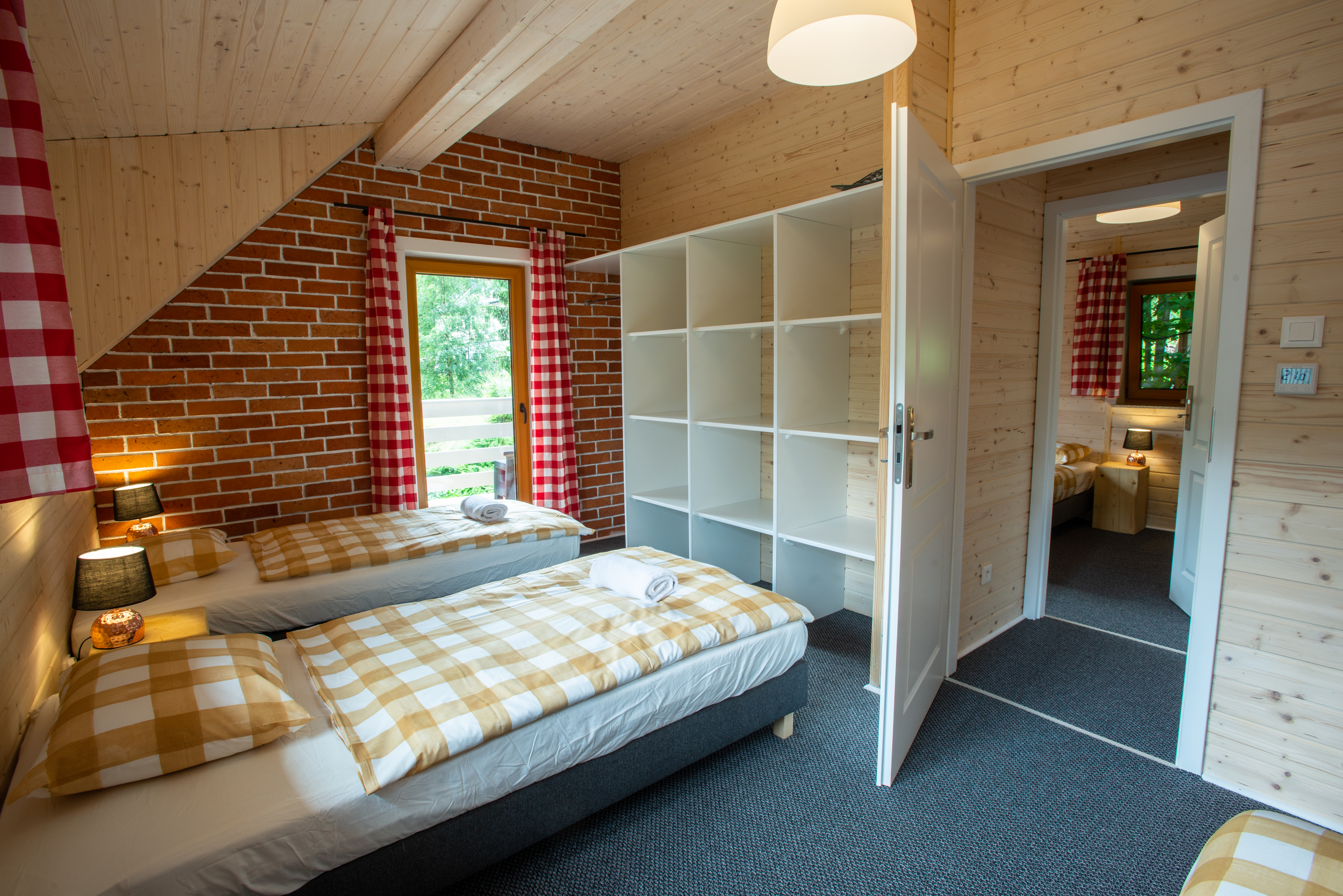 Na piętrze znajdują się dwie sypialnie. Jedna wyposażona jest w jedno łóżko podwójne 140×200 i dwa łóżka pojedyncze 90×200 oraz druga także wyposażona w łóżko podwójne 140×200 i dwa łóżka pojedyncze 90×200. Na parterze opcjonalnie można rozłożyć kanapę narożnikową uzyskując dwa dodatkowe miejsca do spania 140×200. Domek może przyjąć maksymalnie 10 gości, przy czym im mniejsza ilość osób tym bardziej komfortowy pobyt.