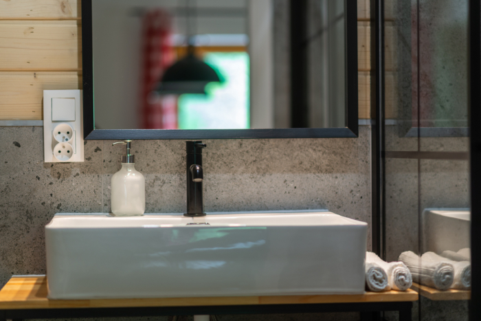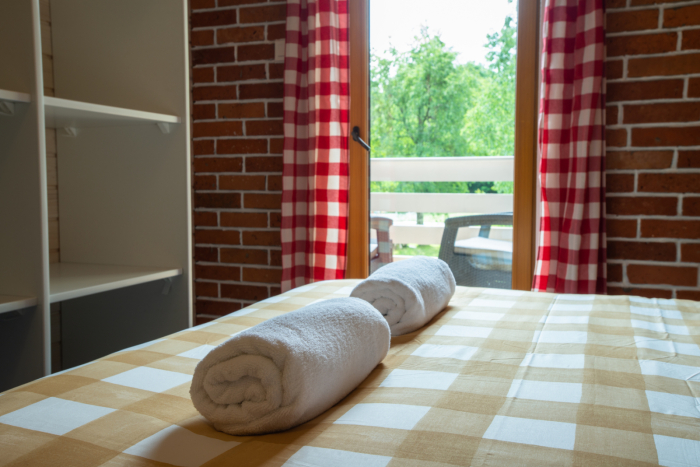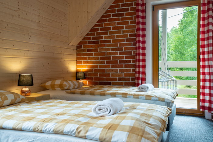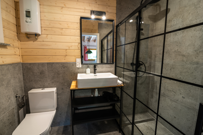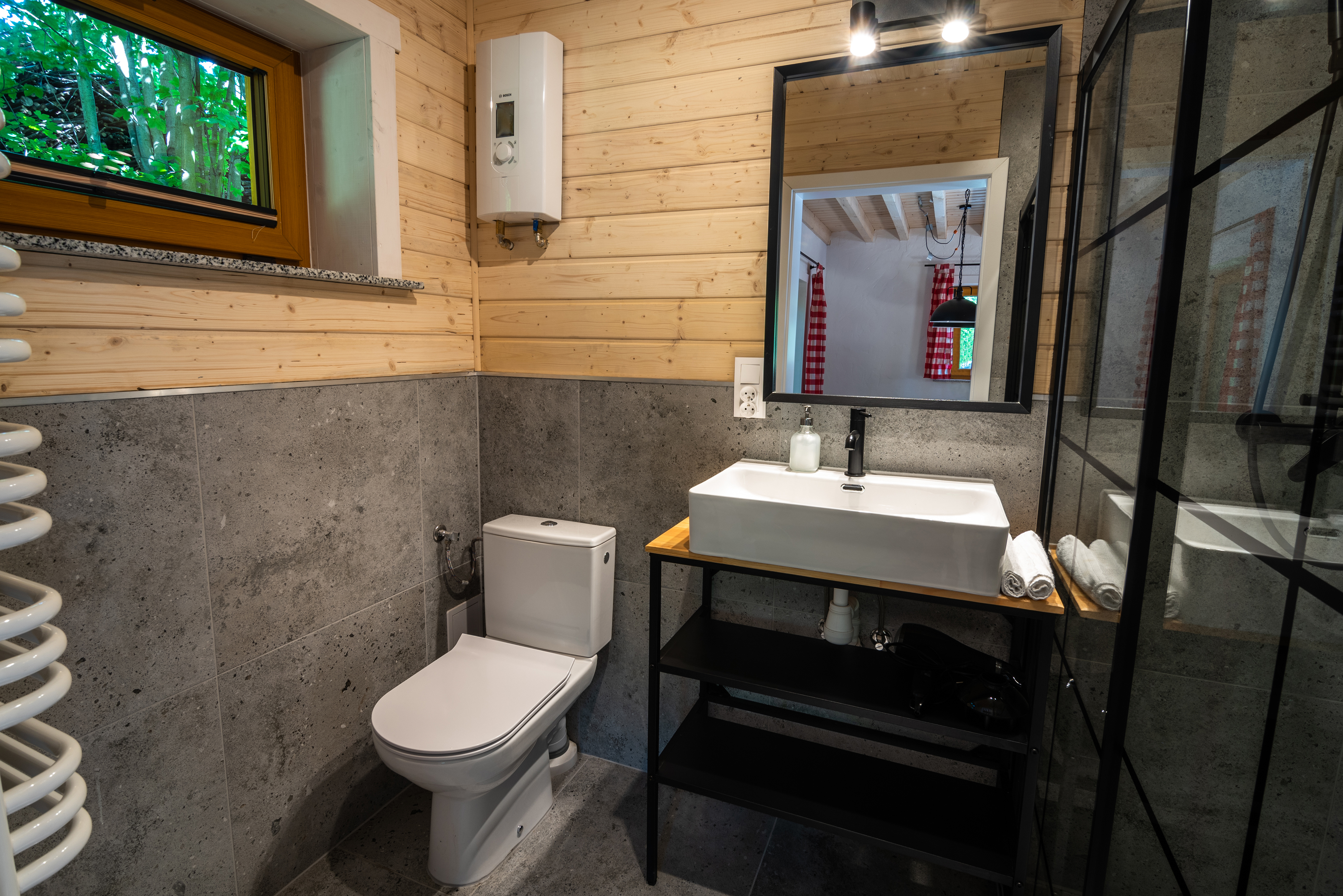 Każdy dom posiada jedną, komfortowo urządzoną łazienkę, w której znajduje się prysznic z deszczownicą, umywalka oraz WC. Na wyposażeniu łazienki dostępna jest również suszarka do włosów oraz komplet ręczników (małe i duże) dla każdego z gości.