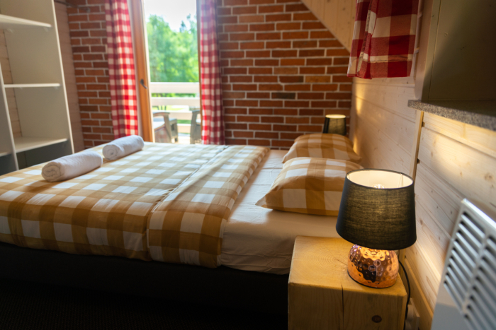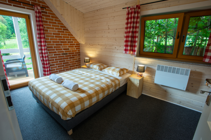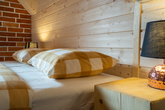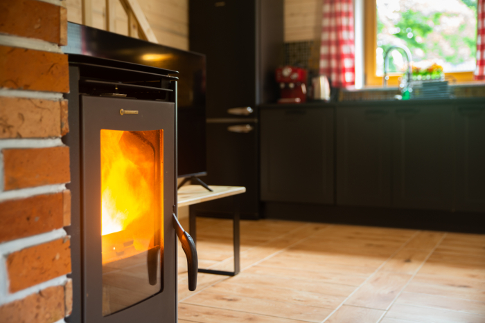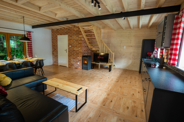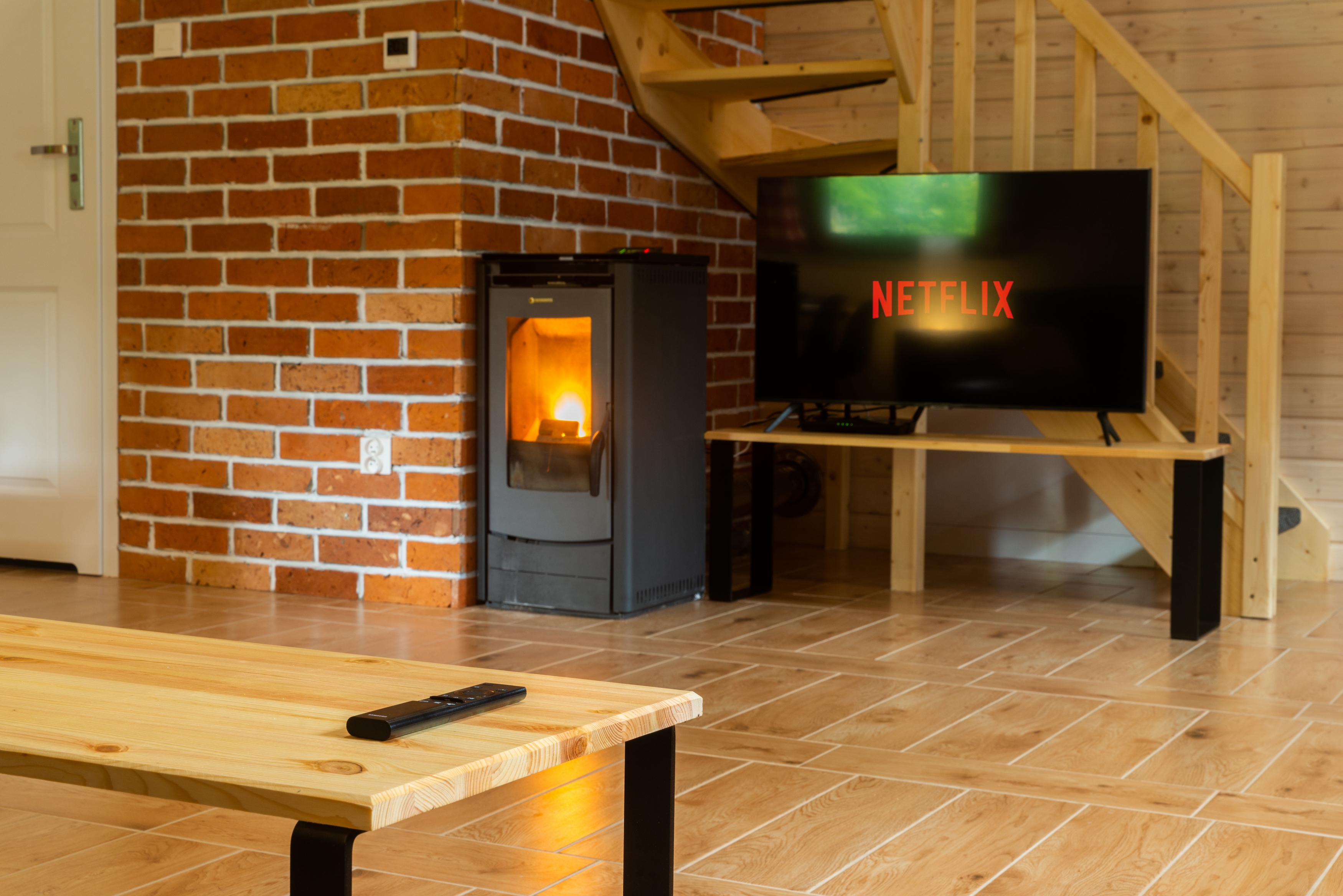 KOMINEK – zasadniczo w sezonie grzewczym w domku działa podgrzewana podłoga, a dla przyjemności do dyspozycji jest kominek na wpół zautomatyzowany, by każdy za pomocą przycisku bez problemu go rozpalił. Kominek zasilany jest Eko pelletem - sprasowane trociny.
