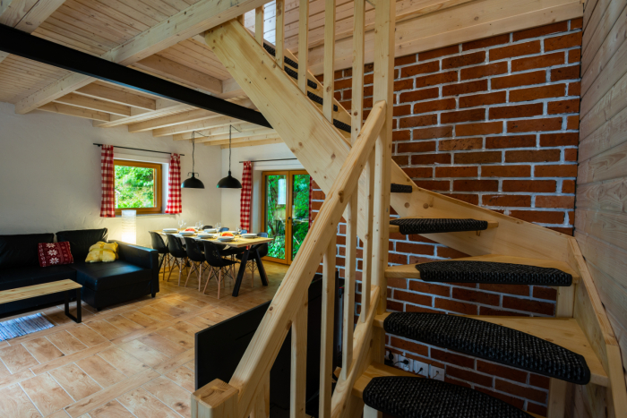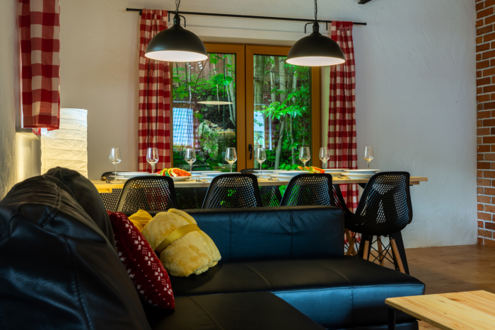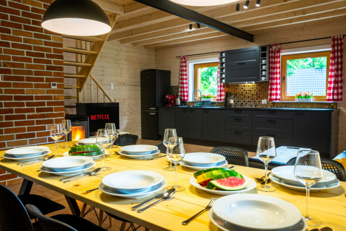 KUCHNIA – jest w pełni wyposażona w drobne AGD – płyta grzewcza indukcyjna 4 palniki, wysoka lodówka z zamrażalnikiem 200cm, zmywarka 60cm, kuchenka mikrofalowa, pralka, czajnik elektryczny, a także zastawę stołową dla maks. 10 osób (sztućce, talerze, szklanki, kieliszki, garnki, patelnie, tabletki do zmywarki etc.), ciśnieniowy ekspres do kawy, kawiarka.