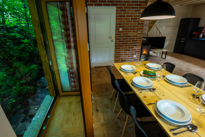 STRUMIEŃ – tuż przy ścianie domku płynie strumień, widoczny także z wewnątrz domku.