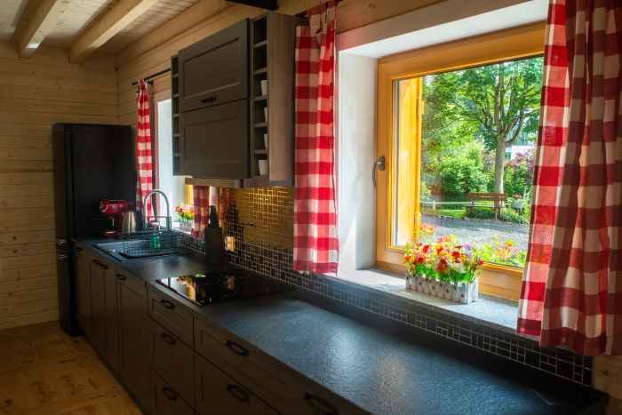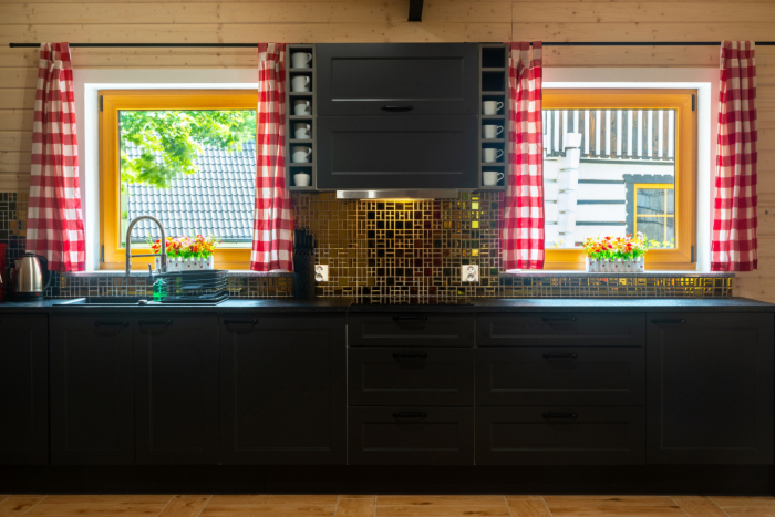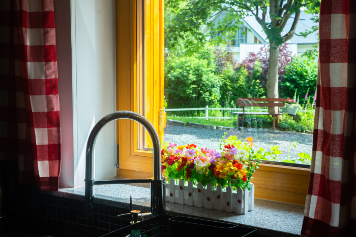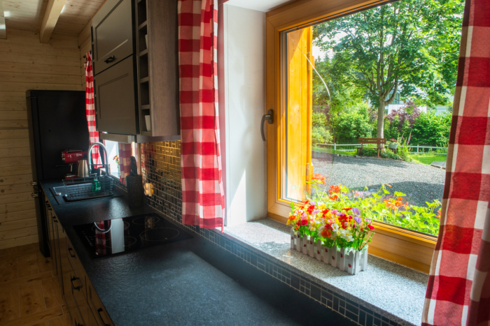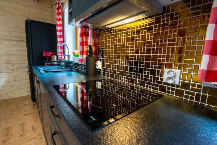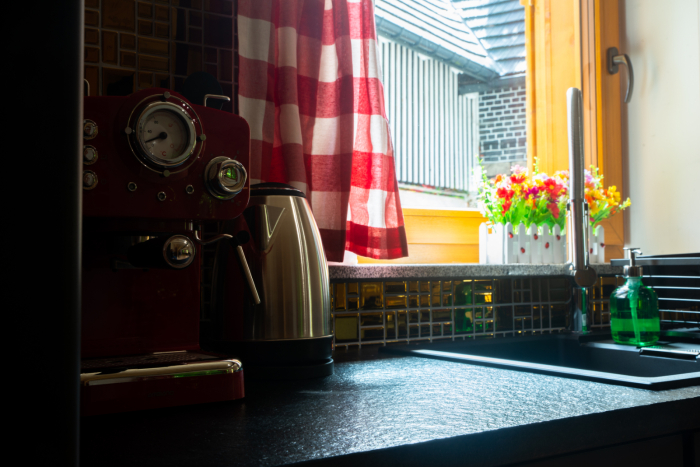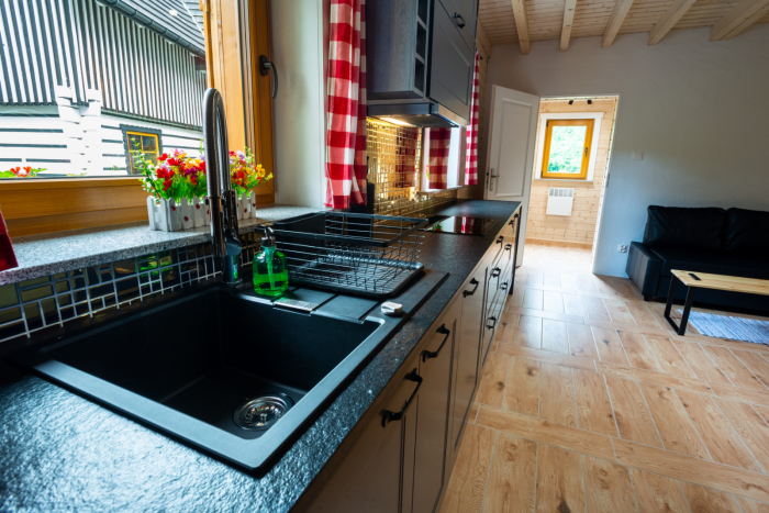 jest w pełni wyposażona w drobne AGD – płyta grzewcza indukcyjna 4 palniki, wysoka lodówka z zamrażalnikiem 200cm, zmywarka 60cm, kuchenka mikrofalowa, pralka, czajnik elektryczny, a także zastawę stołową dla maks. 10 osób (sztućce, talerze, szklanki, kieliszki, garnki, patelnie, tabletki do zmywarki etc.), ciśnieniowy ekspres do kawy, kawiarka.
