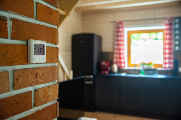 zasadniczo w sezonie grzewczym w domku działa podgrzewana podłoga, a dla przyjemności do dyspozycji jest kominek na wpół zautomatyzowany, by każdy za pomocą przycisku bez problemu go rozpalił. Kominek zasilany jest Eko pelletem - sprasowane trociny. Oświetlenie w domu wykonane jest w technologii LED, dzięki czemu najmocniejsza żarówka zużywa 5W energii elektrycznej czyli 10-20x mniej, niż standardowa żarówka.